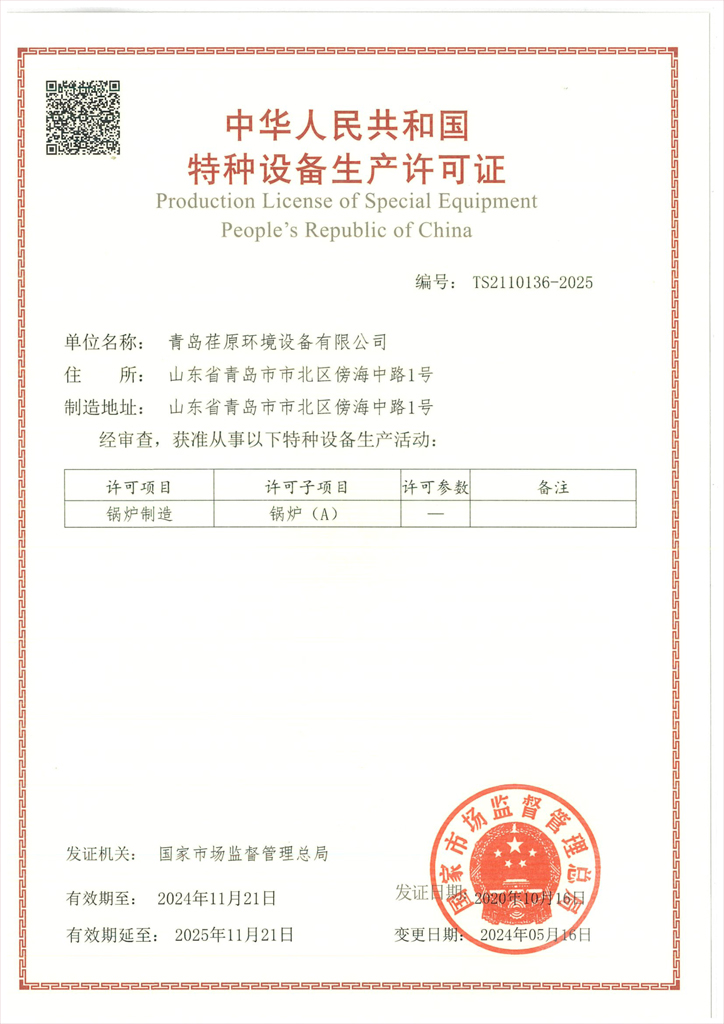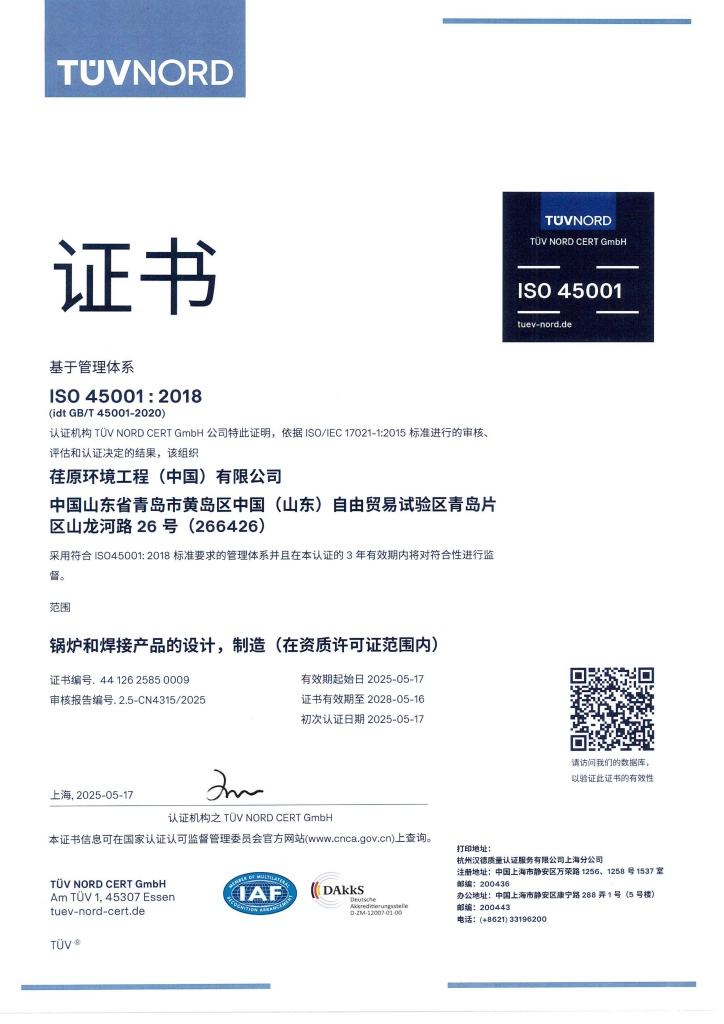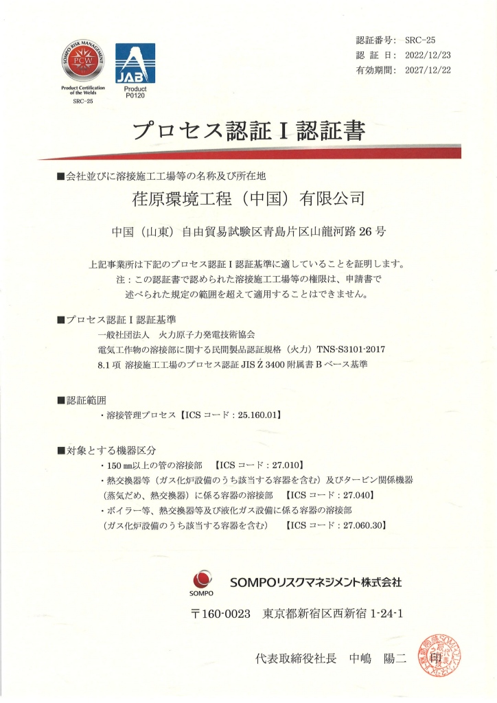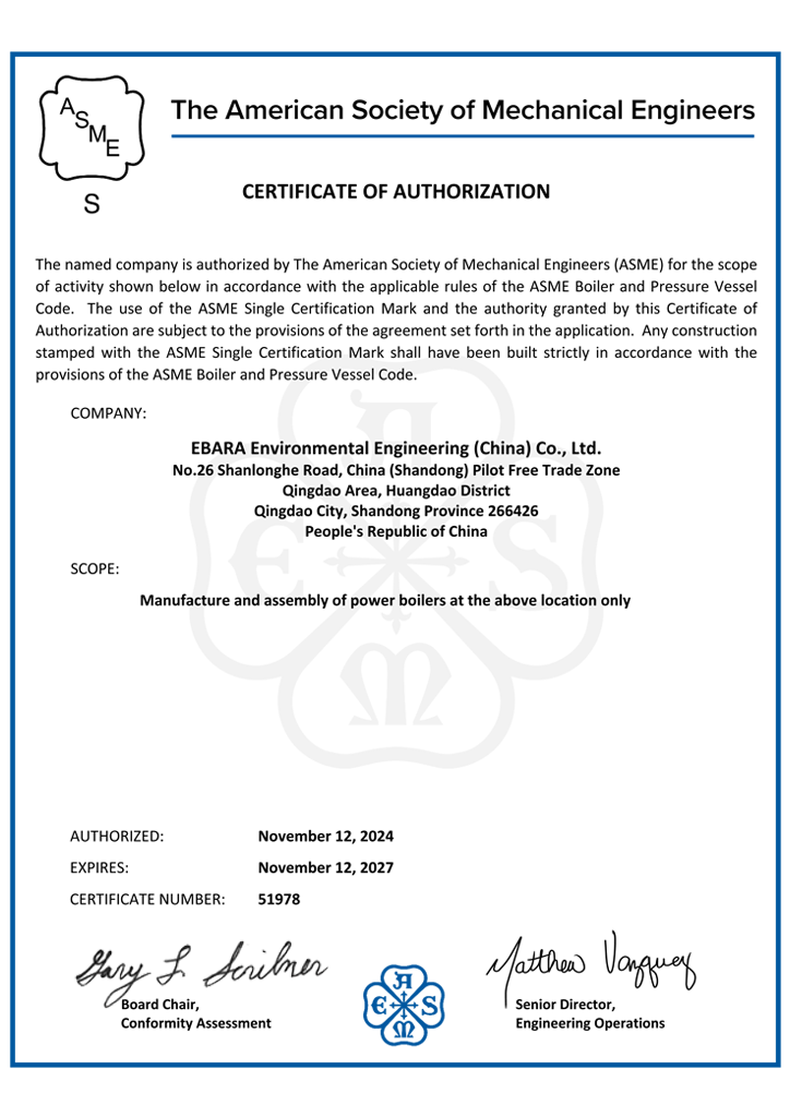 2025年1月1日に吸収合併された青島荏原環境設備有限公司は1992年に設立され、国家A級ボイラー製造許可、ASME(S&U)証明書及びISO 9001/ISO 14001/ISO 45001などの多種資格認証を取得した。