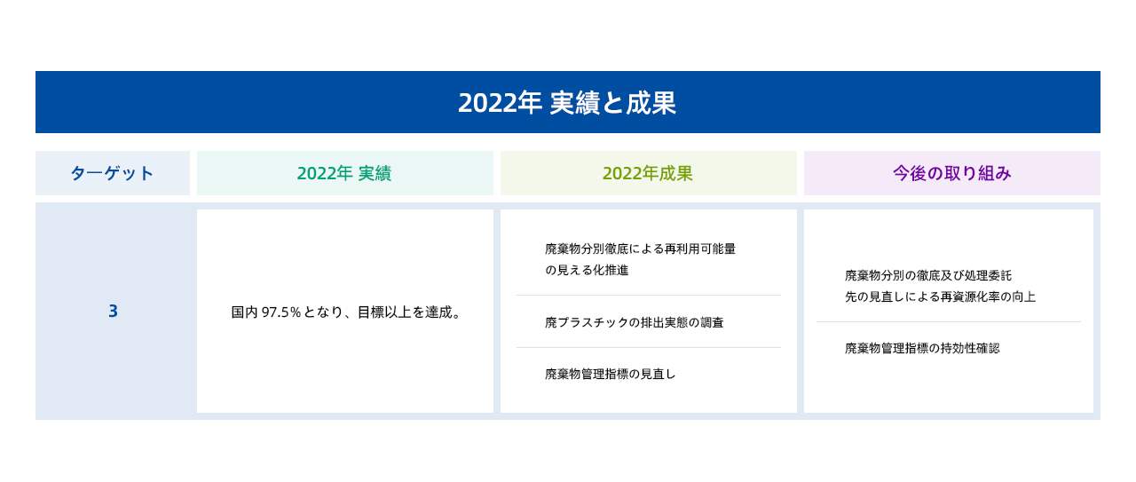 資源循環、サーキュラーエコノミー社会の構築に貢献するため、廃棄物の再資源化率について国内 95%以上を維持します。